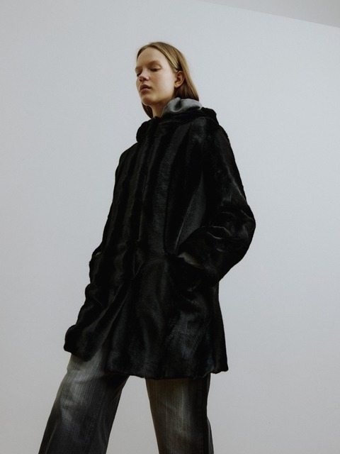 [몰리올리] BONNI NU 후드 퍼 스트라이프 하프 코트 [블랙]