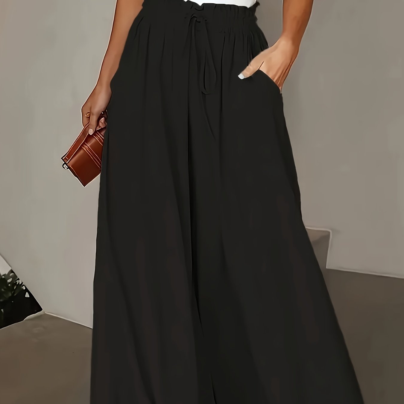 TEMU 여성 캐주얼 루즈핏 와이드레그 팬츠 드로스트링 허리 - 블랙, 올시즌 편안함, 캐주얼 의상, 캐주얼 의상|와이드레그 팬츠|드로스트링 허리띠