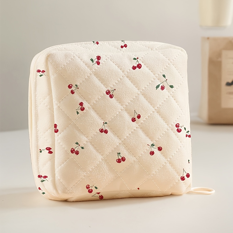 TEMU 체리 패턴 프린트 그리드 휴대용 대용량 생리대 보관 가방, 헤드폰 및 소형 액세서리에 적합, 지퍼 클로저 여성 제품 보관 가방, 동전 지갑 & 파우치 세트, 화장품 파우치, 메이크업 백
