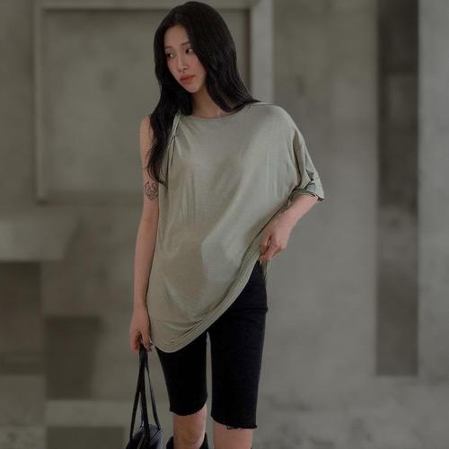 [옷자락]여성 롱 어깨꼬임 반팔 여유핏 스판 티셔츠