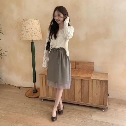 [신상오픈런]여성 울 레이스 레이어드 미디 스커트 스트랩 밴딩