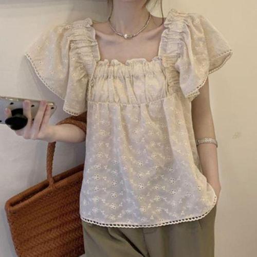 샵앤) 여성 프릴 V넥 꽃펀칭 레이스 반팔 블라우스 MSE-WBL-20687-베이지