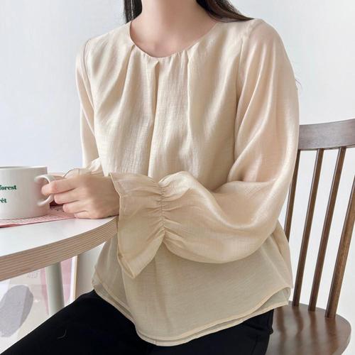 [샵앤][샵앤] 여성 실키 페미닌 셔링 밑단 긴팔 프릴 블라우스 NYS-WBL-4954-베이지