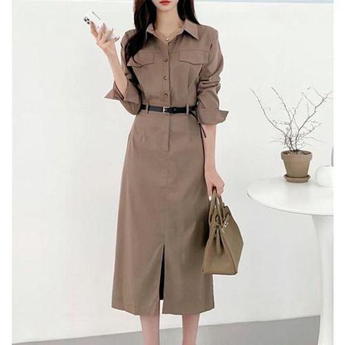 [에이치플러스몰]여자클래식하객룩 브라운 벨트포함 셔츠롱원피스