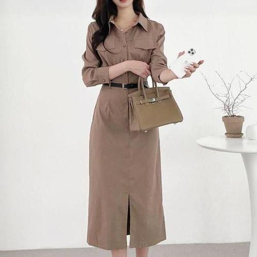 여자 하객룩 롱 셔츠원피스 벨트포함 클래식 오피스 정장원피스