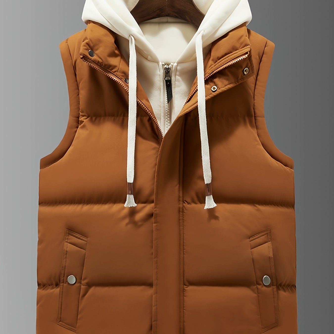 TEMU 남성용 후드 민소매 조끼 - 두꺼운 보온 지퍼 재킷, 브라운/화이트 컬러, 세탁기 사용 가능 레이어링 코트, 일상 및 정장용 내구성 있는 지퍼 클로저