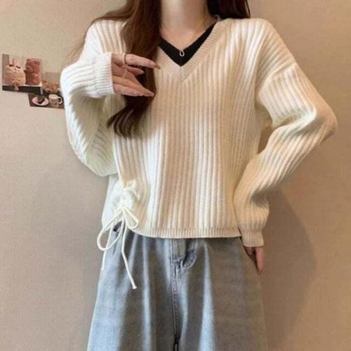[셀럽하우스]브이넥 VOXL9291 인기 여자 스타일 레이스업 감성 골지 긴팔 니