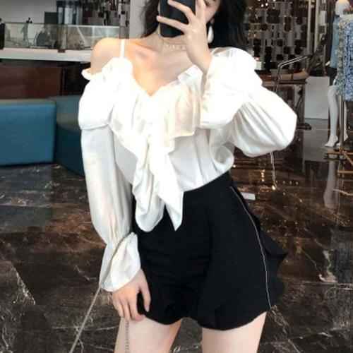 [셀럽하우스]프릴 YJJB6989 오프숄더 브이넥 소매밴딩 데이트룩