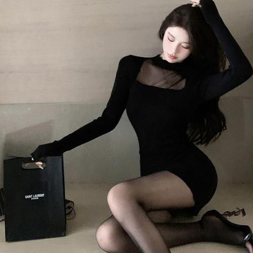 [오노마] ONM 반목 시스루 블랙 니트 미니원피스 슬림핏 연말파티룩