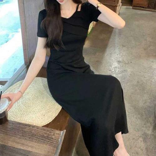 [에이치플러스몰]편한 슬림핏 롱원피스 블랙 셔링 데일리 데이트 코디