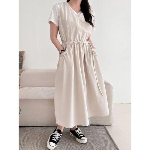 [샵앤]여성 V넥 옆선 허리끈 민소매 레이어드 롱 원피스N NYS-WDR-4481-블랙