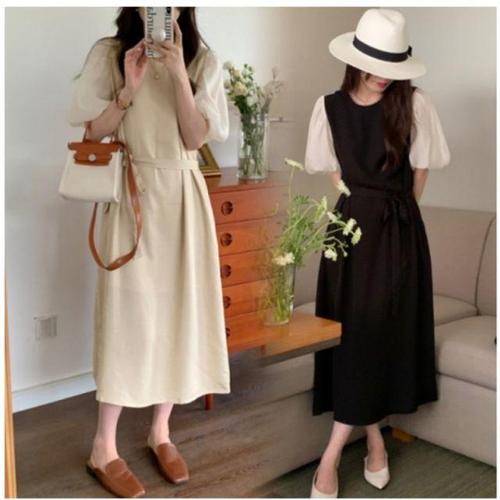 베이지 배색소매 롱원피스 블랙 WD5495D