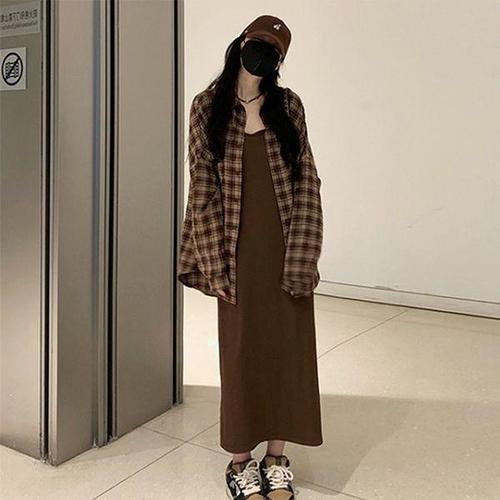 [무드무드]뉴트 체크 셔츠 나시 원피스 set