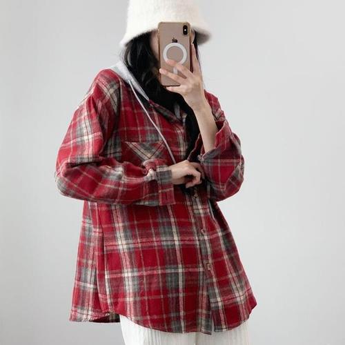 [다잇템]여자 격자 배색후드 빨간 크리스마스 셔츠 (27272003A)