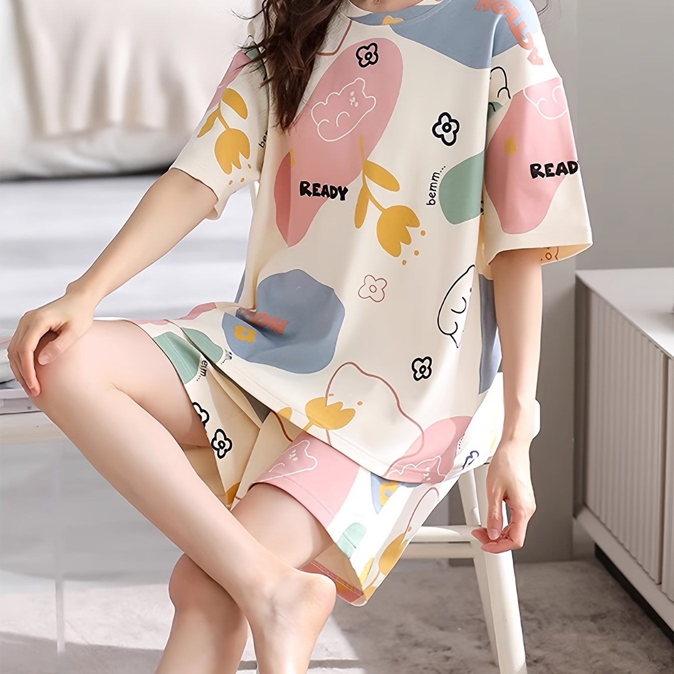 TEMU 여성용 아이스 슬리키 섬유 카툰 캐주얼 웨어러블 루즈 라운지웨어 세트