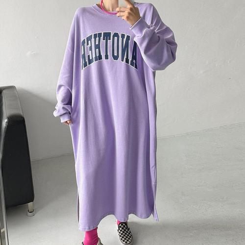 [옷자락] 여자 보라색 레터링 양트임 빅사이즈 홈웨어 롱원피스