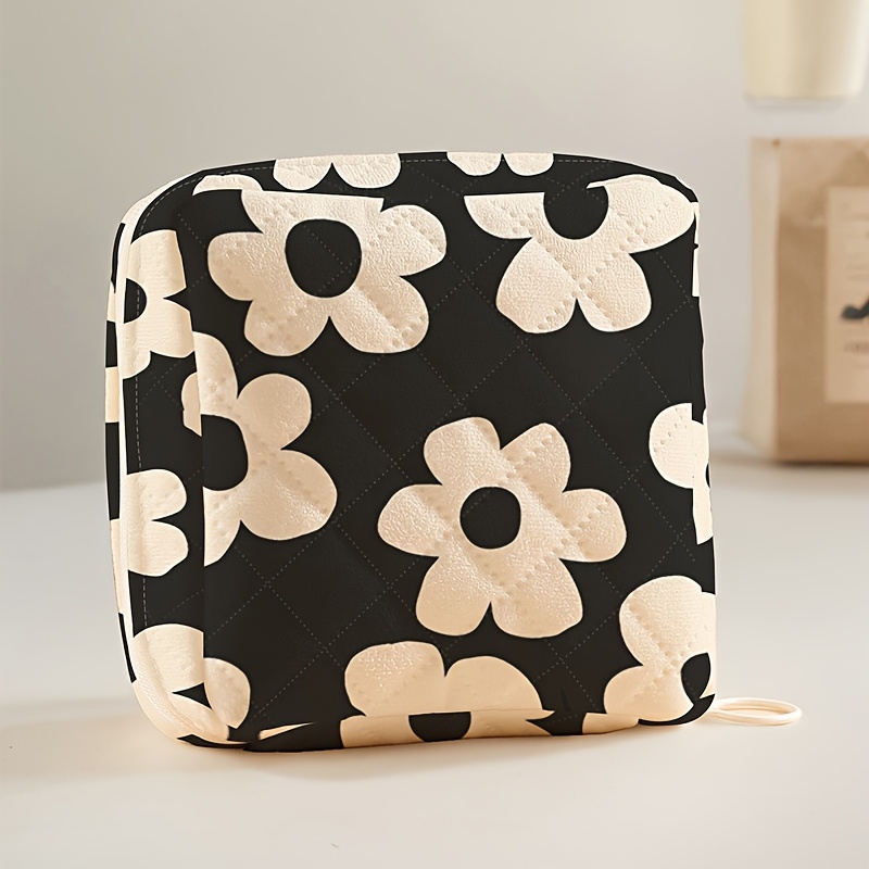 TEMU 작은 꽃무늬 프린트 그리드 휴대용 대용량 생리대 보관 가방, 헤드폰 및 소품 수납 가능 지퍼형 여성용 제품 정리 파우치