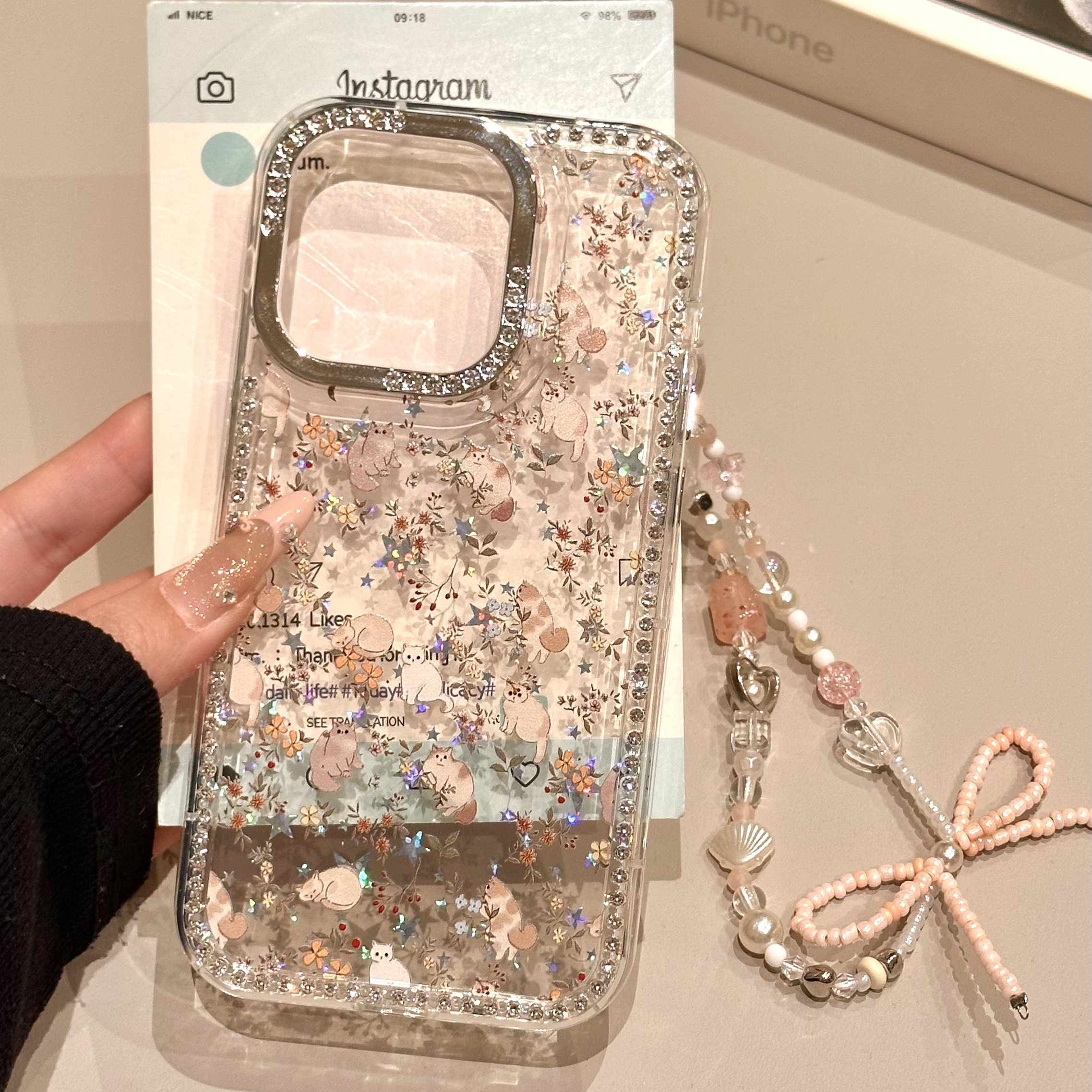 TEMU 아이폰 15 Pro Max용 인스타 스타일 재미있는 만화 레이저 아기 고양이 휴대폰 케이스, 반짝이는 라인석 프레임 포함, 아이폰 16 Pro용 귀여운 하트 디자인, 아이폰 13용, 낙하 방지 신상 케이스, 아이폰 14용, 아이폰 12용 보호 커버