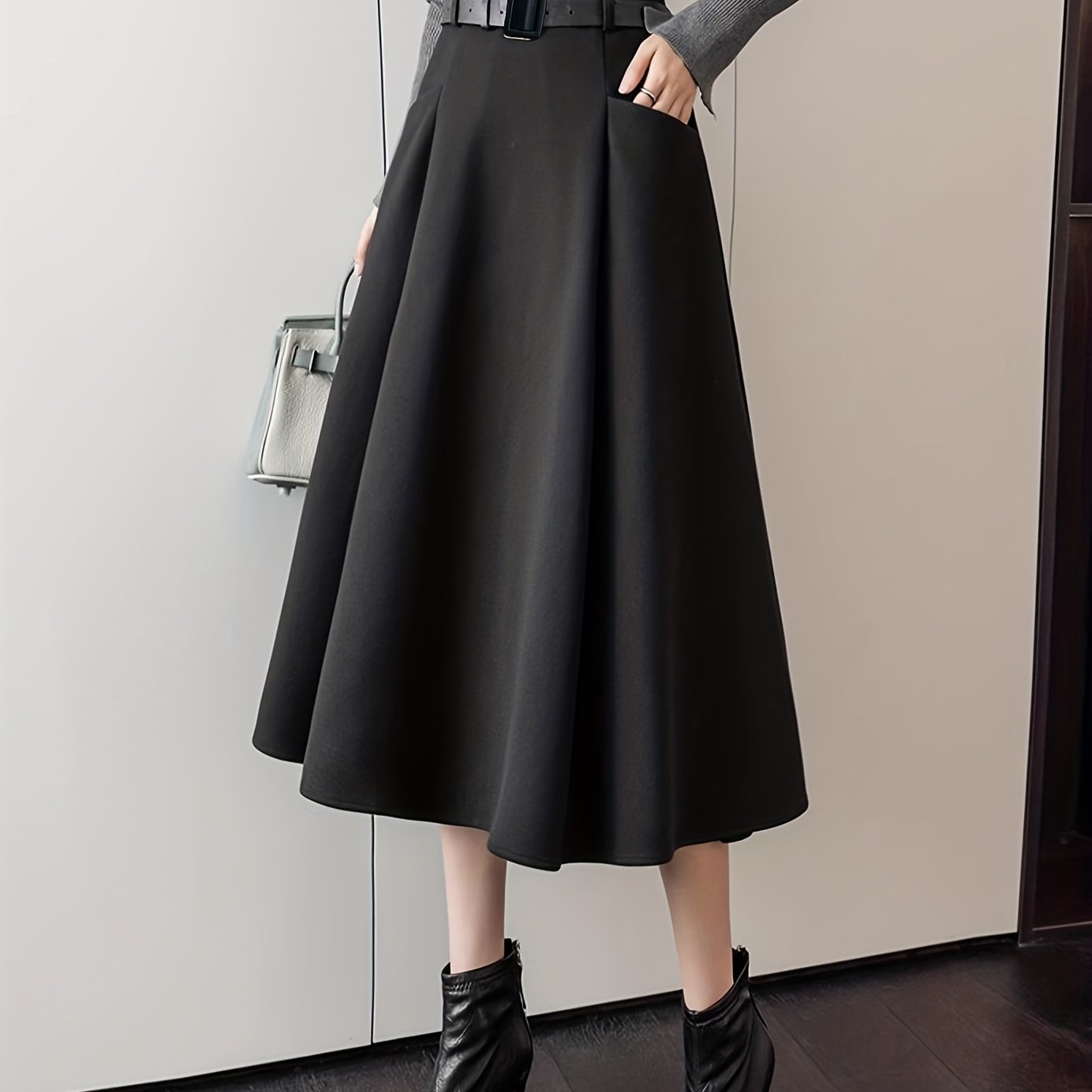 TEMU 플러스 사이즈 - 여성용 캐주얼 미디 스커트 더블 포켓 - 플레어드 헴, 루즈핏, 부드러운 플리스 소재, 단색, 가을/겨울에 완벽한 의류 | 플레어드 헴 스커트 | 건축, 귀여운 스커트