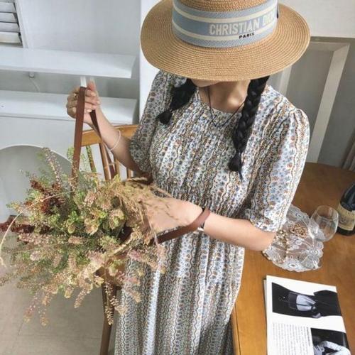 플라워 허리 잔꽃무늬 반팔 원피스 여자 스모크 밴딩 WFLQ835