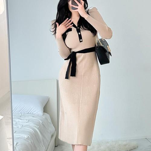 |CCO46D0|스램버 긴원피스 주머니 스프링 하객룩 여성 허리스트랩 스웨터 배색