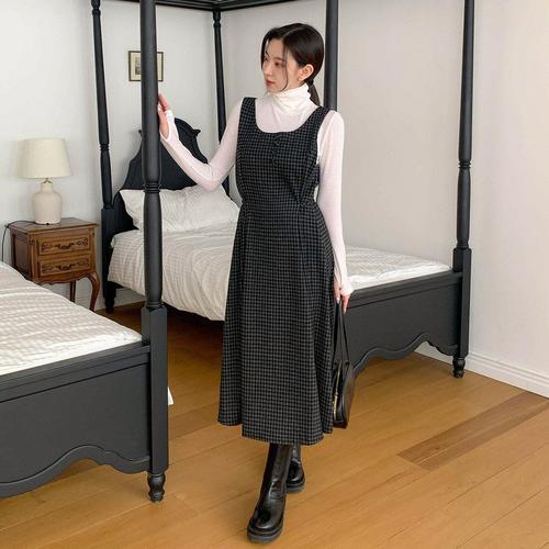 [시크블랙]토라잇 빈티지 모리걸 민소매 체크 롱 원피스