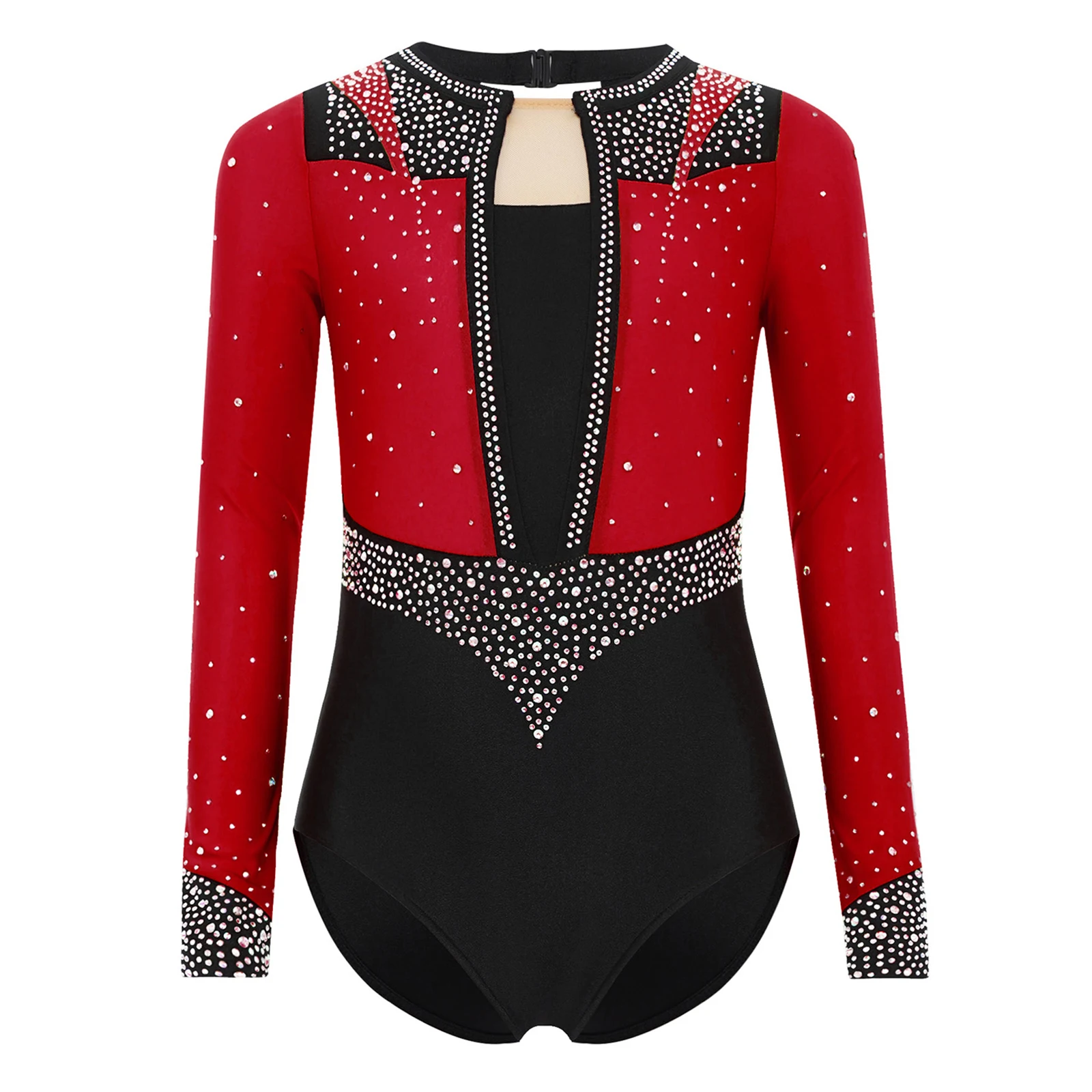 여자 반짝 이는 라인 석 리듬 체조 레오타드 긴 소매 바디 슈트 댄스웨어 피겨 스케이팅 무대 공연 의상