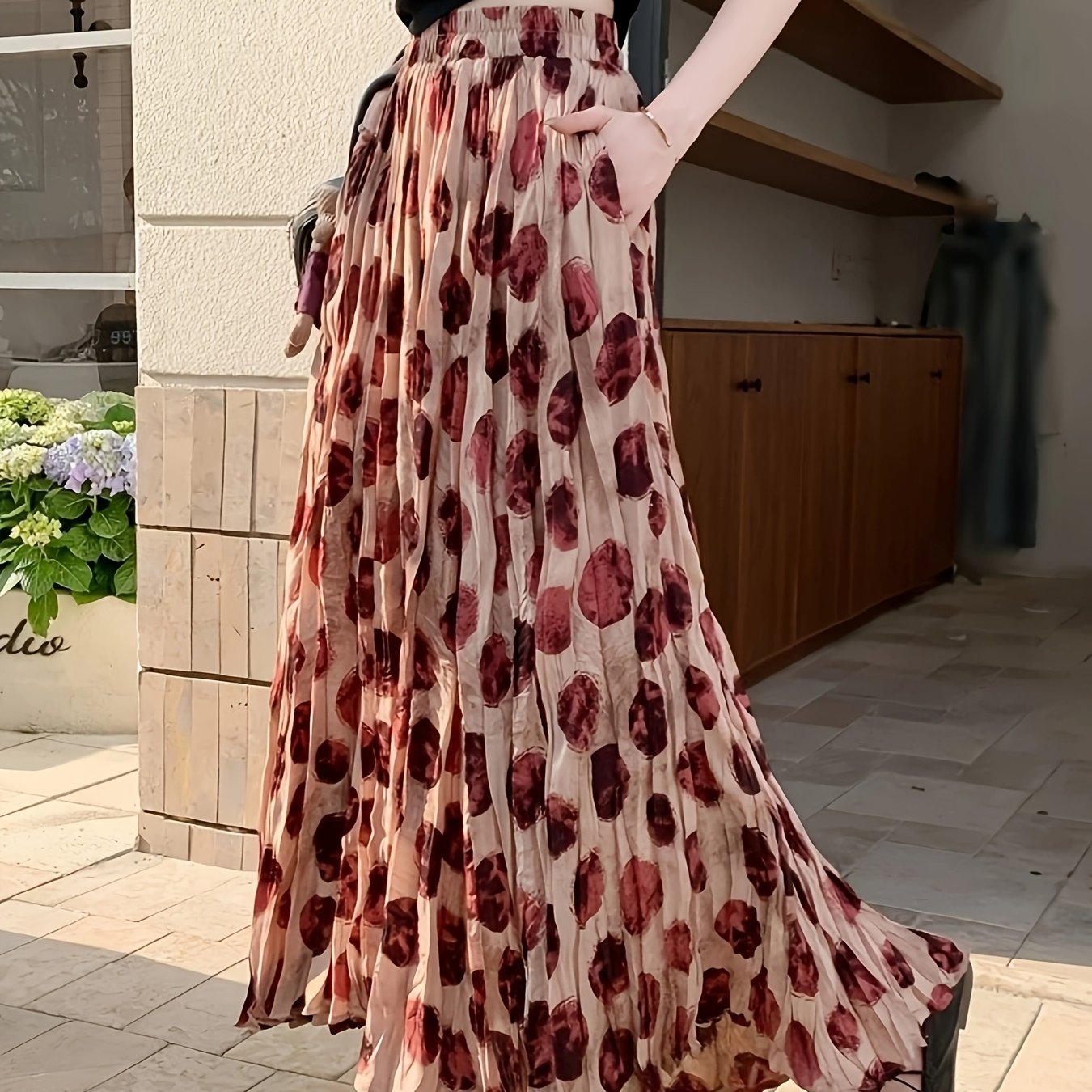 TEMU 프렌치 플리츠 물방울 무늬 스커트 여성용 네이처 레트로 루즈핏 빅 스윙 미디 레인지 플로럴 스커트