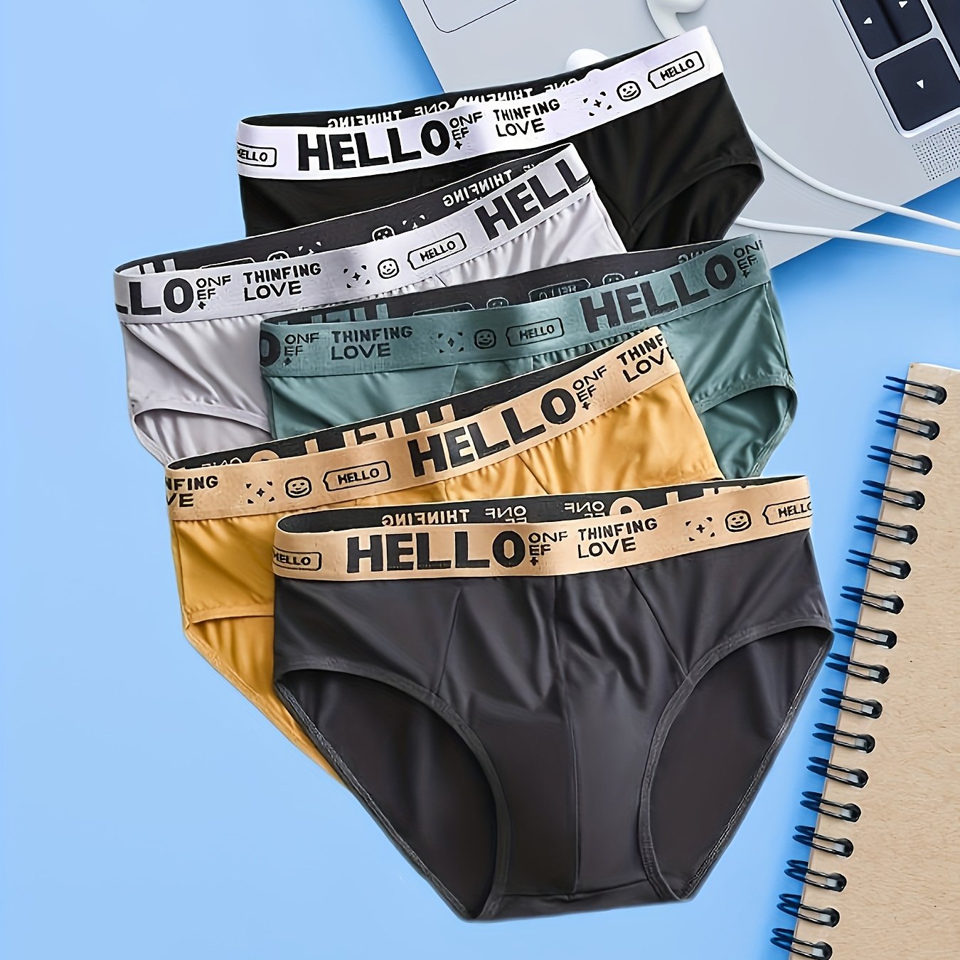 TEMU 헬로 레터 프린트가 있는 5개입 슬리키 파이버 패브릭 남성용 브리프 - 고탄력 레귤러핏 언더웨어, 5색 세트 (블랙/화이트/틸/오렌지/그레이)