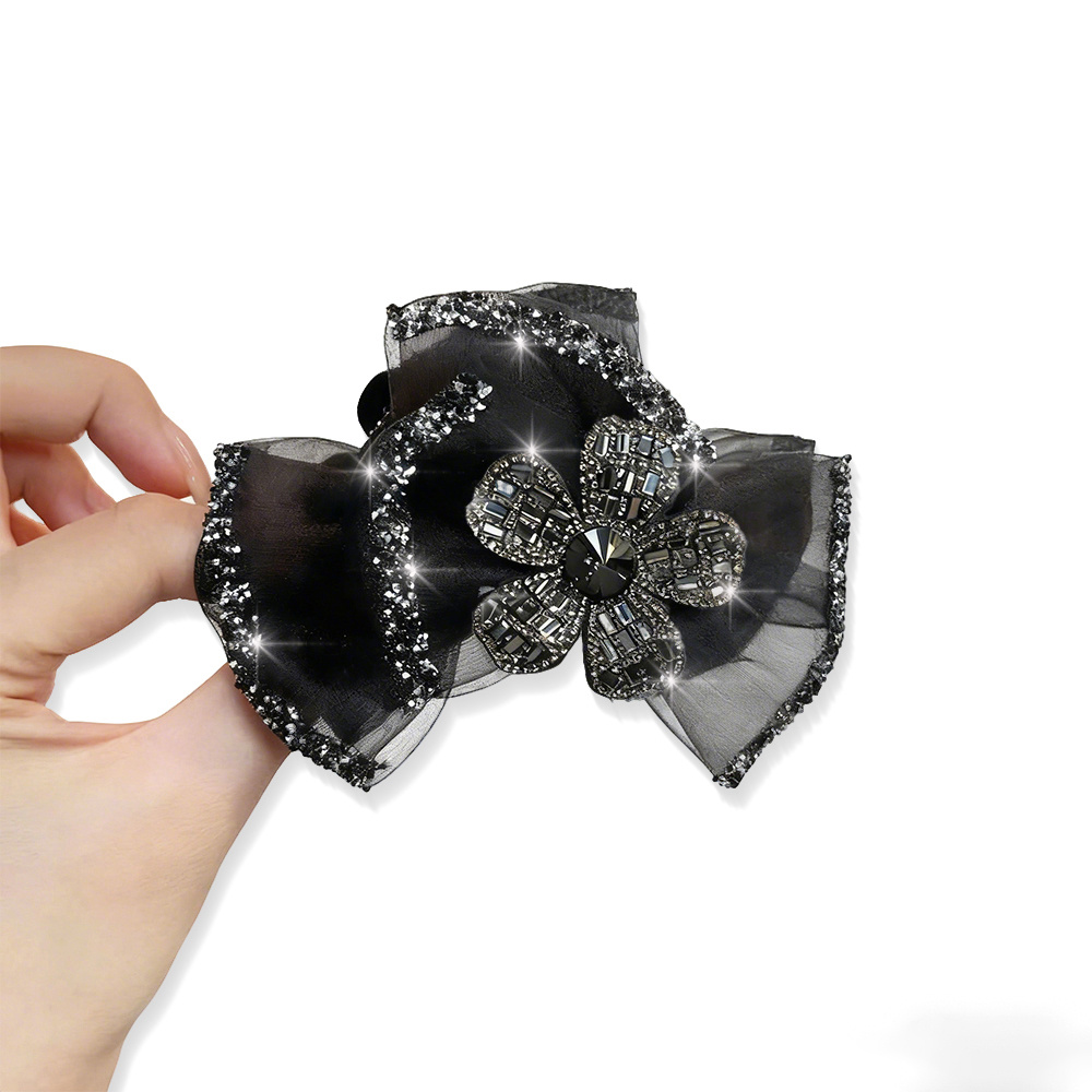 TEMU 새로운 반짝이는 라인스톤 꽃 블랙 메시 리본 아크릴 헤어 클립, 스타일리시한 여성용 중간 사이즈 꽃 리본 헤어핀 (AB 표면), 미끄럼 방지 상어 클립 특징, 모든 계절에 적합하며 일상복 및 축제 파티에 완벽