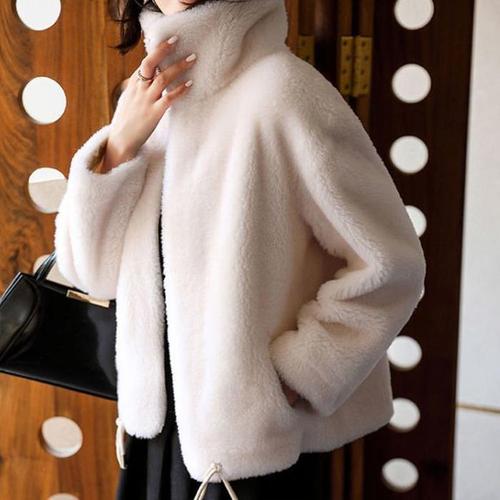 ORZQU 여성 봄 인조 양털 코트 루즈핏 심플 라운드 숏 플리스 뽀글이 자켓