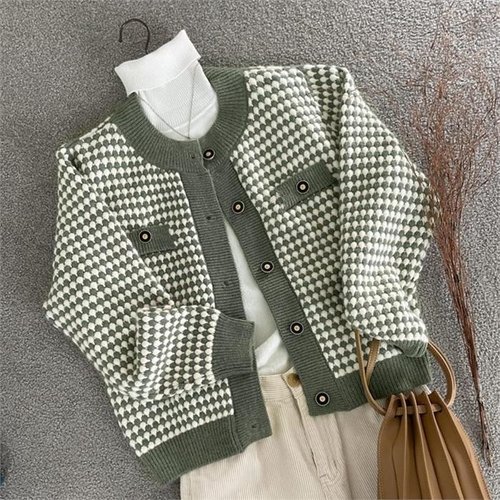 여자 V넥 무드 엠보싱 단추 엷은 울니트 가디건_3