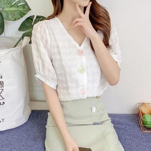 [엄지척]체크 브이넥 여성 블라우스 여름 데일리 반팔 티 셔츠_19651234_667501