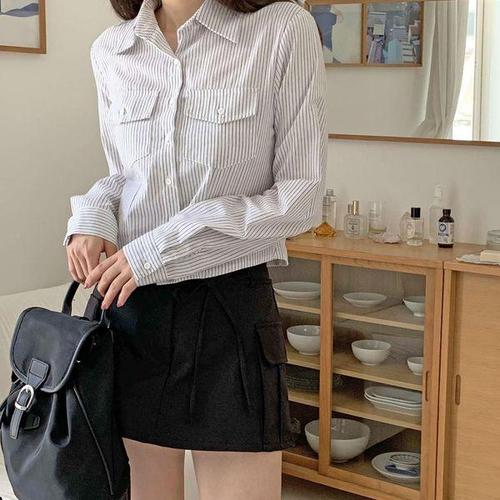 [옷자락] 여성용 면 스트라이프 더블포켓 슬림 크롭 셔츠