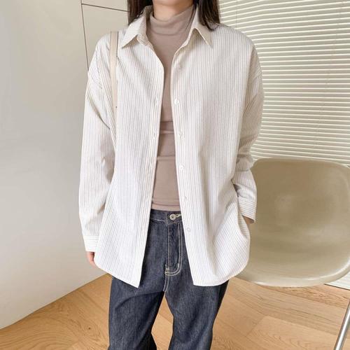 [신상오픈런]여성용 루즈핏 긴팔 카라넥 스트라이프 코튼 셔츠