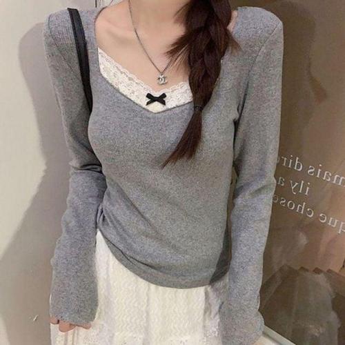 티 티셔츠 스 그 레이 가을 예쁜 리본 여자 WFLMFA3