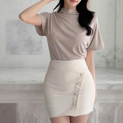 [옷자락] 여성 단색 면혼합 셔링 반목 반팔 티셔츠