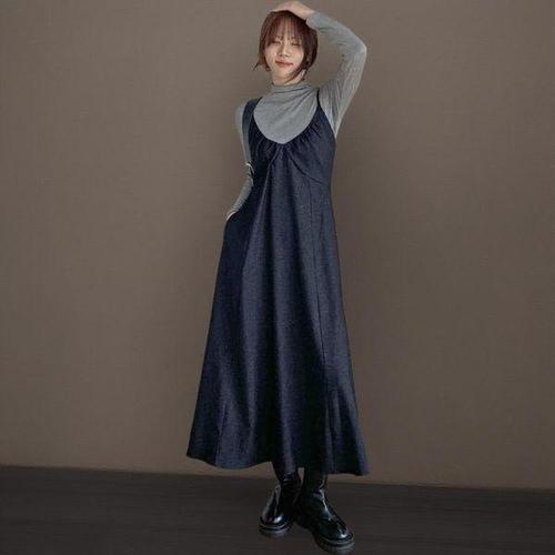[신상오픈런]여성 코튼 목폴라 티셔츠와 뷔스티에 롱 원피스 세트