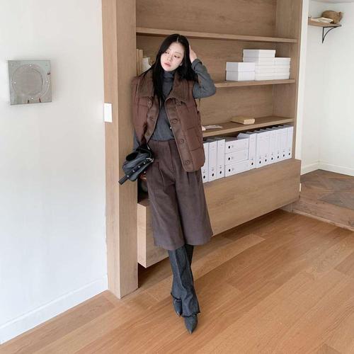 POMTOR 가을 겨울 여성 모직 7부 와이드 팬츠 루즈핏 정장 바지