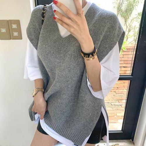 [에이치플러스몰]언발 기장 옆트임 여성 니트 조끼 브이넥 기본 디자인