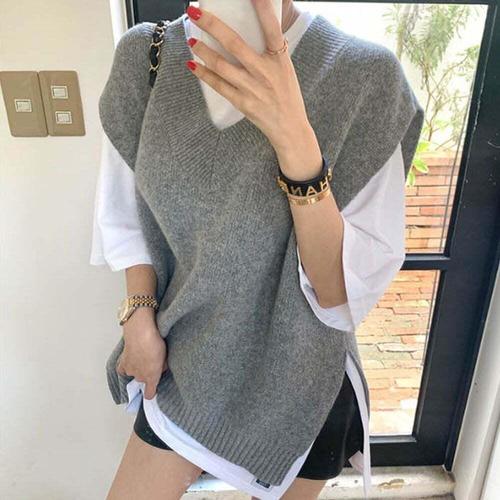 Wiseha 여성 니트 조끼 루즈핏 옆트임 브이넥 베스트