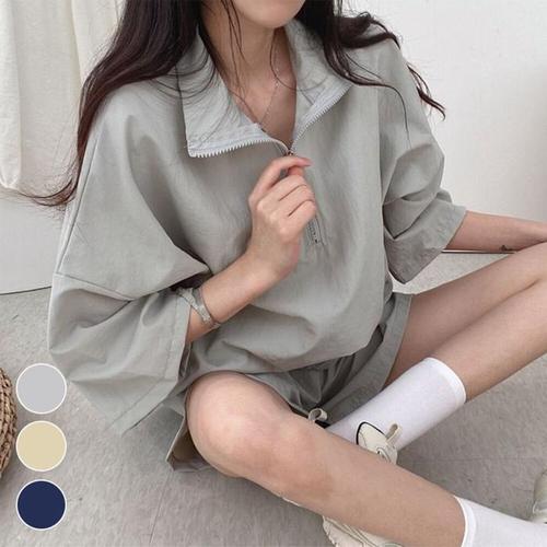 |KCD23E9|반팔아노락 하프집업 루즈핏 밴딩 바스락반바지 투피스