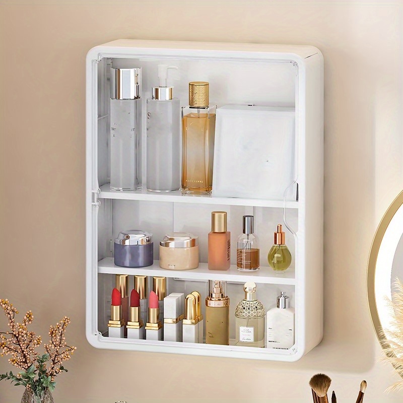 TEMU 1개 벽걸이형 투명 욕실 화장품 정리함, 다층 디자인, 무타공 설치, 욕실 제품 및 향수 보관용, 방진 기능, 욕실을 깔끔하고 정돈되게 유지, 화장실에도 적용 가능, 다양한 뷰티 아이템을 쉽게 분류하여 보관