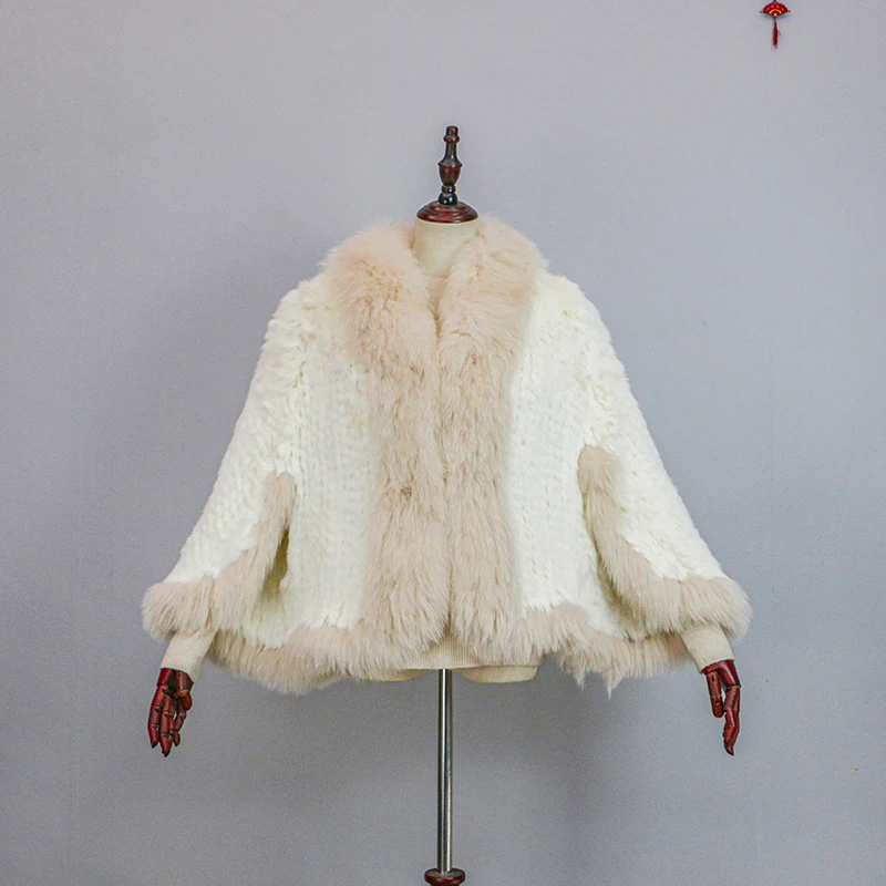 새로운 엑스트라 롱 리얼 천연 니트 토끼털 숄 코트, 여우털 칼라 여성 패션 니트 재킷 케이프