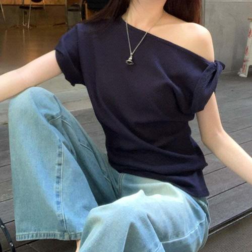 [셀럽하우스]언발 JHSD3376 오프숄더 니트티 한쪽 어깨끈 꼬임 디자인 반팔
