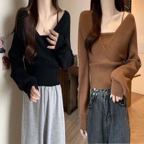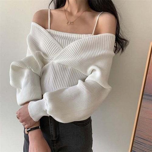 [셀럽하우스]여성 HVWI0721 브이넥 오프숄더 끈 봄 니트 티셔츠