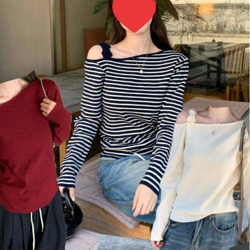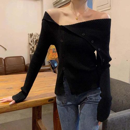 [셀럽하우스]여성 JDCZ6730 여리핏 언밸런스 버튼오프숄더 긴팔 니트티셔츠