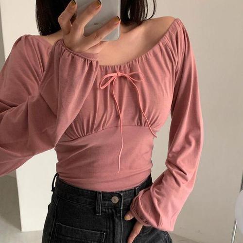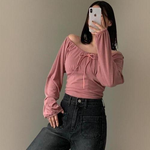 [신상오픈런]여성 오프숄더 리본 셔링 슬림핏 가을 긴팔 크롭 티셔츠