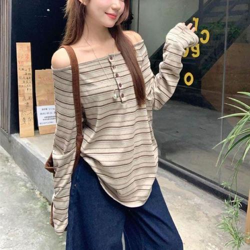 [에이치플러스몰]여성 단가라 오프숄더 캐주얼 청순 어깨트임 긴팔 티