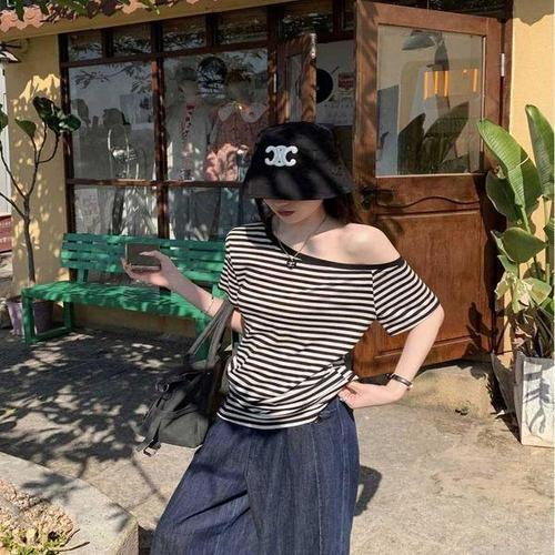 [에이치플러스몰]여자 여리핏 숏 오프숄더 스트라이프 반팔티셔츠